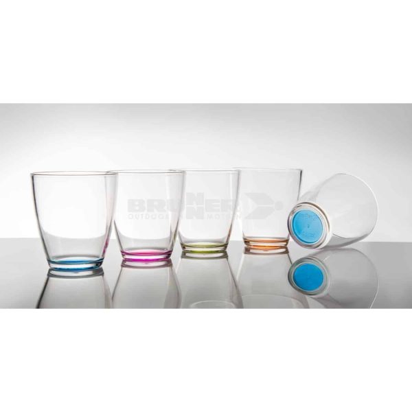 Bicchieri dai colori piacevoli e vivaci realizzati in materiale plastico alimentare. Dotati di anello antiscivolo. Impilabili.