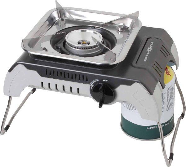 Nuovo fornello a gas portatile con gambe pieghevoli. Utilizza cartucce filettate da 450 g. Leggero, compatto e facile da trasportare, ideale per il campeggio o il picnicking. Include una valigetta in plastica per il trasporto.