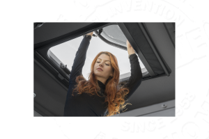 La finestra superiore (dimensione cm 70×60) è perfettamente integrata nel design del guscio ed è sollevabile per creare una feritoia parziale, oppure presentarsi totalmente aperta a 90°, in modo da consentire a una persona di stare in piedi nella tenda e affacciarsi dalla apertura stessa.