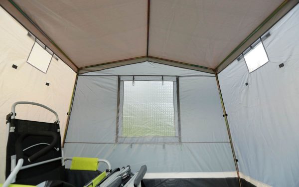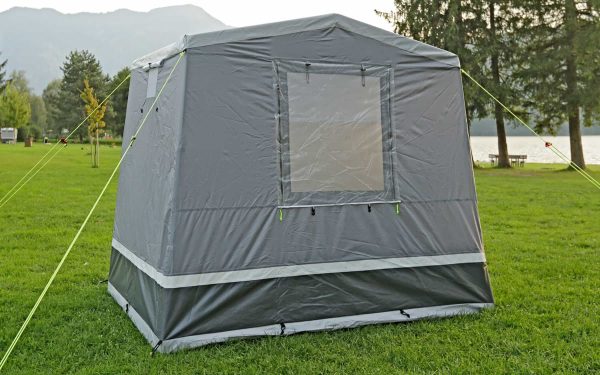 Pratica tenda per attrezzi con tetto a 2 falde, ideale per il campeggiatore ben accessoriato. Robusta, con catino saldamente cucito. L’ampia porta d’ingresso sul lato anteriore può essere comodamente aperta tramite due cerniere e, se necessario, essere aperta come tettuccio parasole. La parete posteriore è dotata di un’ampia finestra a zanzariera che può essere chiusa mediante una pellicola in Crystal. 3 aperture di ventilazione sulla parete anteriore e laterali garantiscono una sufficiente circolazione dell’aria all’interno della tenda. M